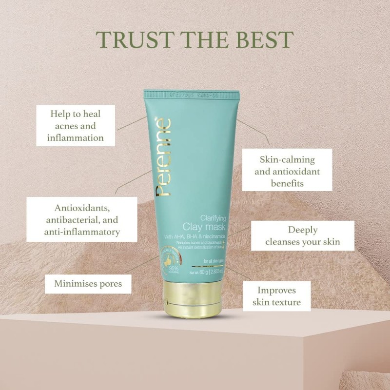 Perenne Clarifying mask is a natural clay mask rich in natural AHA, BHA and niacinamide for instant detoxification of the skin. It controls the sebum production of skin and reduces acne and blackheads.