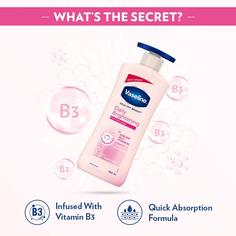 Vaseline believes that everyone deserves healthy skin but healthy skin is not something you get by masking problems or through quick fixes. Exposure to the sun causes your skin to produce melanin which can lead to skin damage, dullness and uneven skin tone. Vaseline Healthy Bright Daily Brightening, our best skin brightening body lotion helps restore dry damaged skin and it gives visibly glowing skin in 2 weeks. With micro droplets of Vaseline jelly, the lotion helps the skin to heal. The lotion also contains vitamin B3, which is known to inhibit the production and transfer of melanin, it helps bring back your skin's healthy glow. Triple sunscreens provide glow protection by fighting UVA and UVB rays to protect your skin's glow from future damage. A daily lotion that is lightweight, fast absorbing and non-sticky lotion making it ideal for you to use all year round. Now you can get healthy, even-toned and glowing skin in just 2 weeks! Use twice a day for best results. Apply generously to your body and massage until absorbed. * Healing by moisturization of normal dry skin. Action in the epidermal area and within the cosmetic domain.