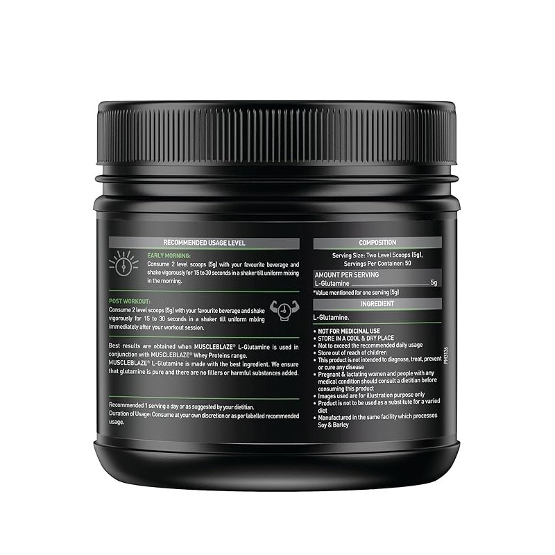 Glutamine is an essential component in the supplementation planning of a majority of bodybuilders and athletes. L Glutamine is a type of amino acid that helps in enhancing the protein synthesis in your body and enables faster recovery. When you recover speedily, you will notice an improvement in your performance at the training sessions and achieve maximum gains. This also results in augmented muscle strength and volume. Those individuals who are involved in heavy duty workouts and intensely fierce training, a quality glutamine supplement can help them achieve a well sculpted physique in less time. Muscleblaze L Glutamine provides 5 g of micronized glutamine that helps in soothing the muscles to boost the recovery process and restricts muscle breakdown post workout. It is free from any kind of adulteration and contains micro filtered L Glutamine that your muscles are easily able to absorb and show better results. Along with muscle growth and faster recovery, it also supports the immune system and increases stamina for better athletic performance. Muscleblaze L Glutamine is available in invigorating Fruit Punch flavour and in an unflavoured format which gives you the flexibility of consumption.
