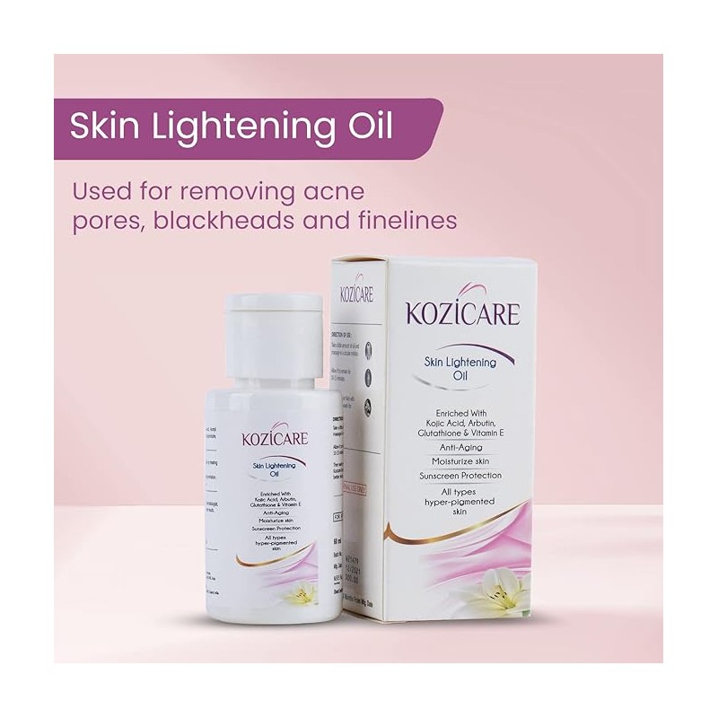 • This oil contains most advanced skin Lightening ingredients like kojic acid, glutathione, arbutus, etc. Kozicare fairness oil is highly recommended for deep action cleaning on skin pores.