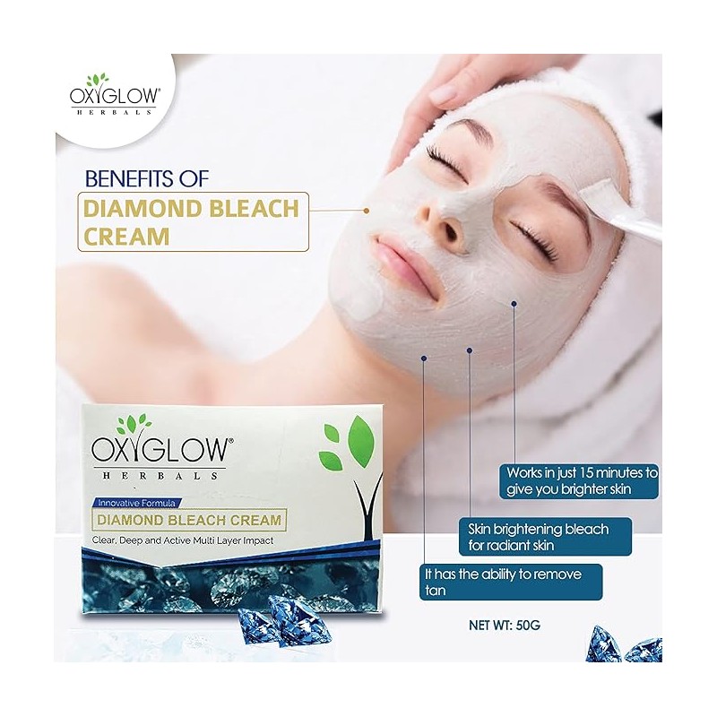 • Diamond Bleach Cream OxyGlow Diamond Bleach Cream has active diamond sprinklers that bleach skin to provide a diamond likes hine and sparkling gaze. Combining the benefits of lemon peel powder and diamond dust, bleaching our skin with OxyGlow Diamond Bleach fights premature aging of skin