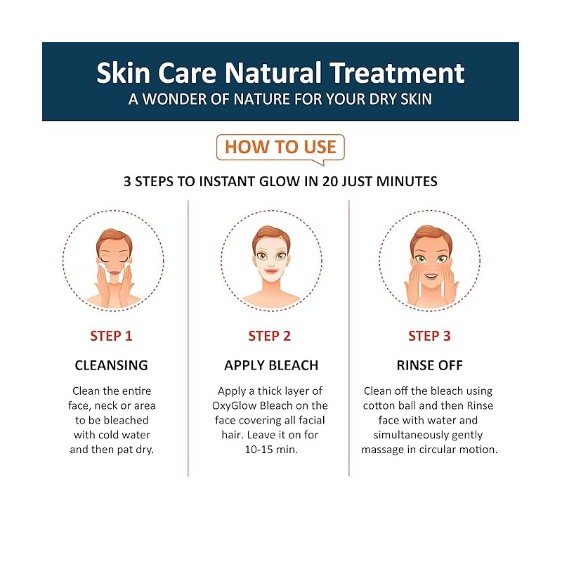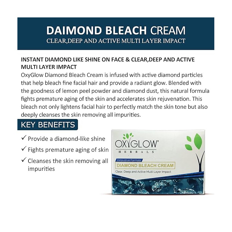 • INSTANT DIAMOND LIKE SHINE ON FACE OxyGlow Diamond Bleach Cream is infused with active diamond particles that help bleach fine facial hair and provide a radiant glow. Blended with the goodness of lemon peel powder and diamond dust, this natural formula fights premature aging of the skin and accelerates skin rejuvenation. This bleach not only lightens facial hair to perfectly match the skin tone but also deeply cleanses the skin removing all impurities.