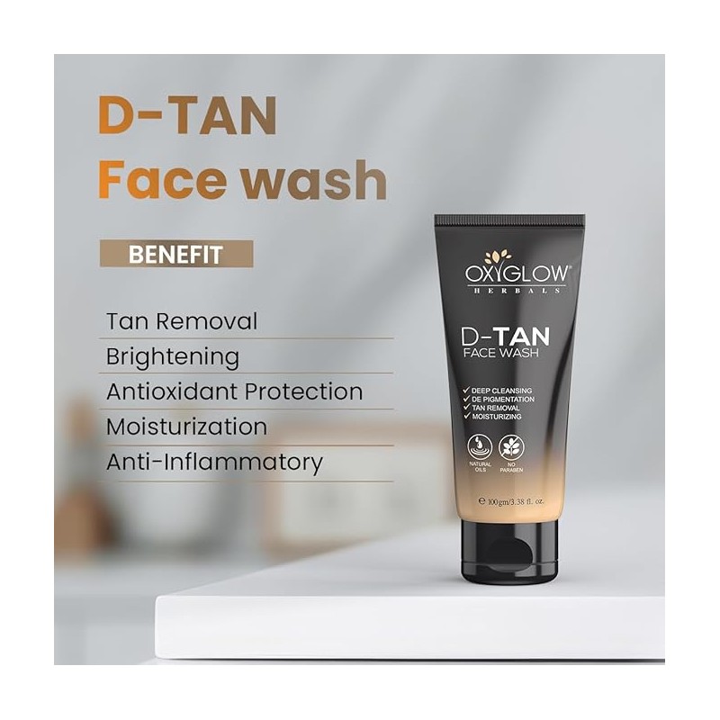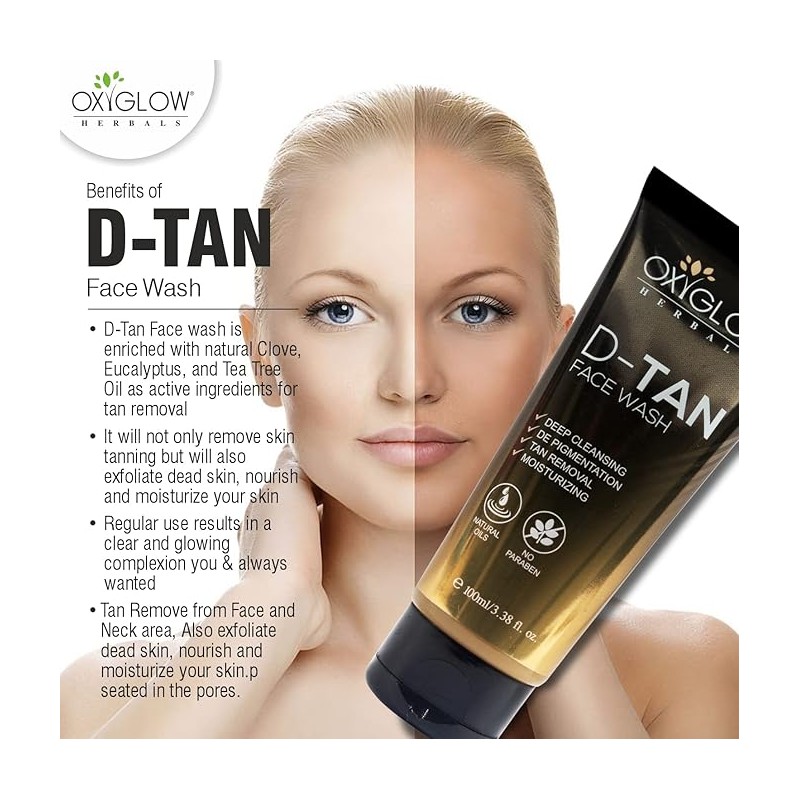 • D-Tan Facewash Oxyglow D-Tan Face wash is enriched with natural Clove, Eucalyptus, and Tea Tree Oil as active ingredients for tan removal. It will not only remove skin tanning but will also exfoliate dead skin, nourish and moisturize your skin. Regular use results in a clear and glowing complexion you & always wanted.