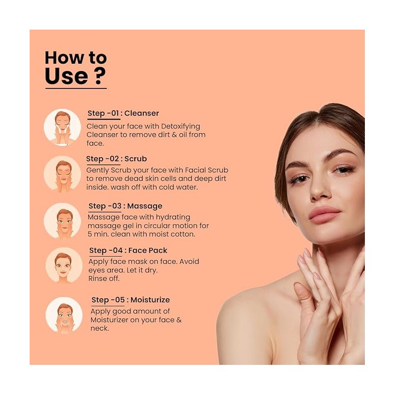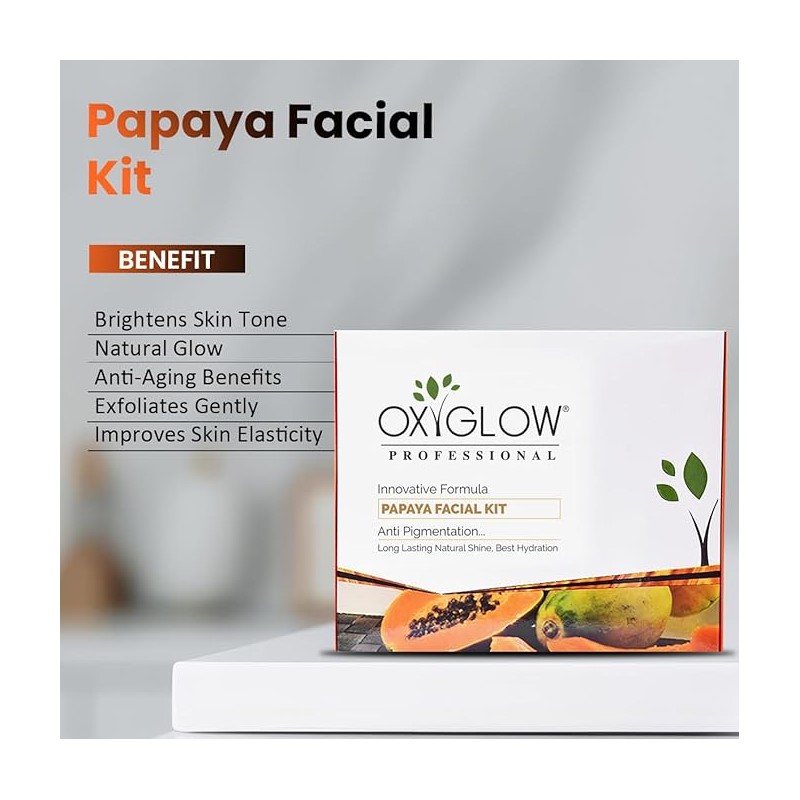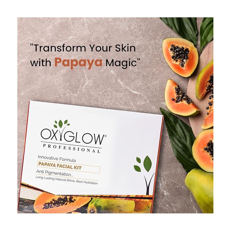 • OxyGlow Papaya Facial Kit is a 6 step deep cleansing routine to improve your skin complexion. The products in this kit are enriched with antibacterial fruit enzymes to deep clean the skin and remove dirt and pollutants while making your skin brighter.