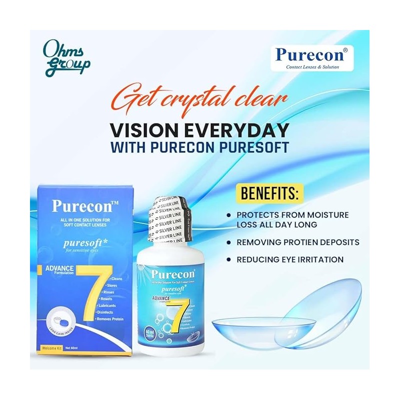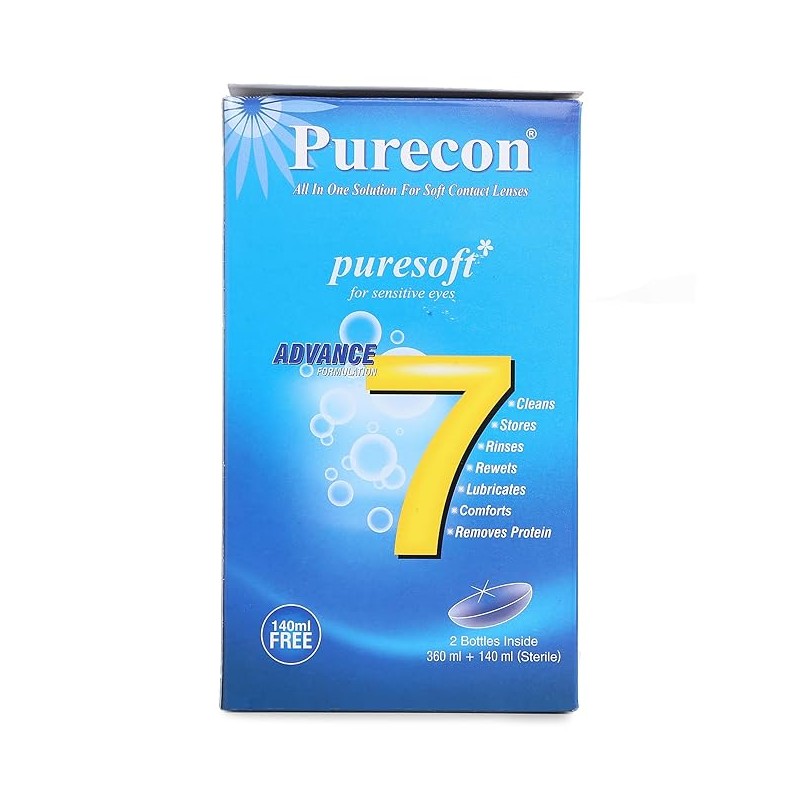 Purecon Puresoft Soft Contact Lens Solution is a comprehensive and gentle solution designed for individuals with sensitive eyes. Offering a complete set of benefits, it serves as a versatile solution for contact lens care by facilitating cleaning, storing, rinsing, rewetting, lubrication, disinfection, and protein removal. Formulated with the specific needs of sensitive eyes in mind, the solution ensures effective disinfection to maintain lens hygiene and clarity.