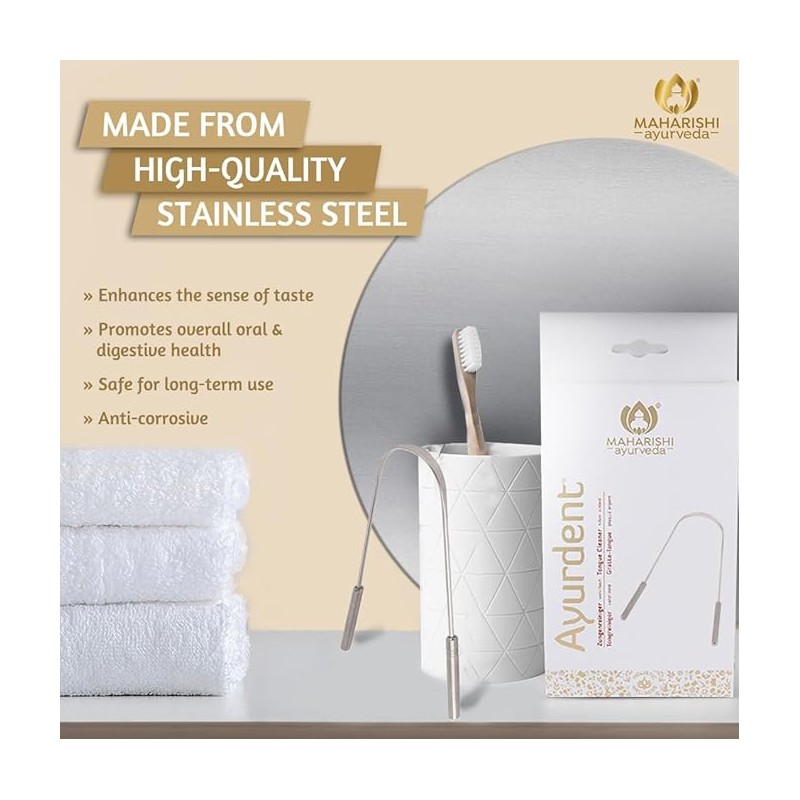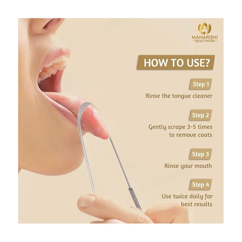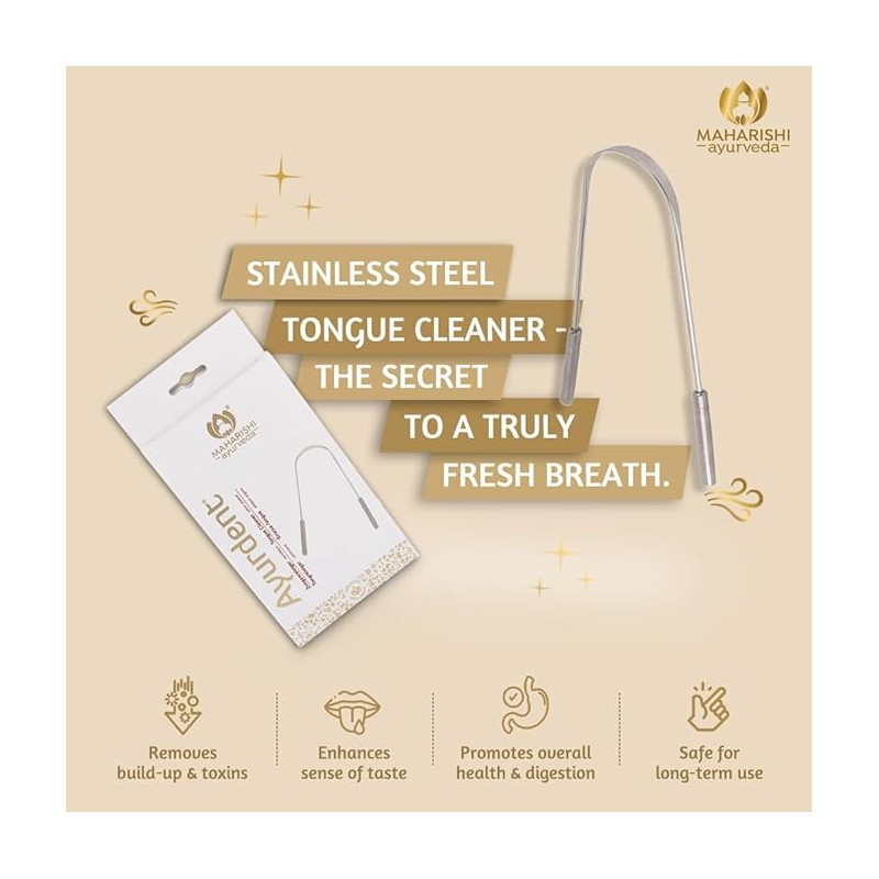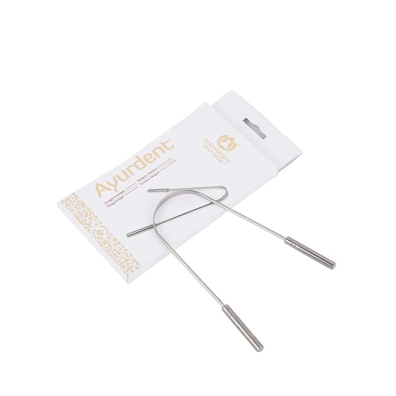• UPGRADE YOUR ORAL HYGIENE WITH OUR PREMIUM-GRADE STAINLESS STEEL TONGUE CLEANER .Maharishi Ayurveda stainless steel tongue cleaner is an optimal choice for a well-rounded oral hygiene routine.