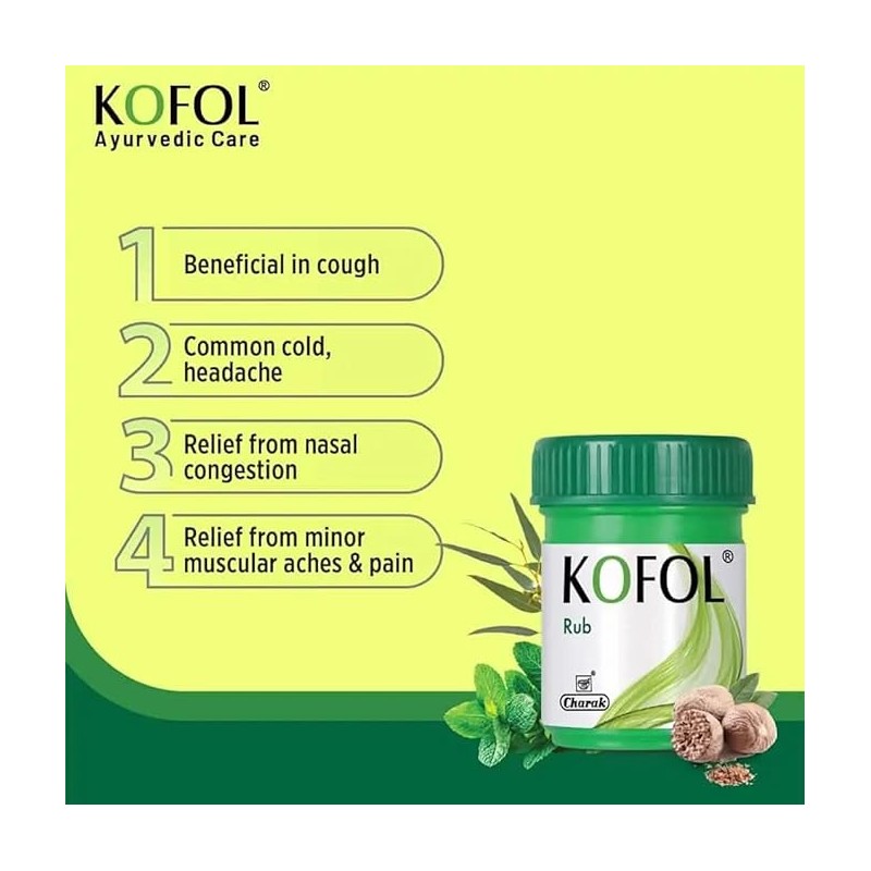 • Usage Instructions: Apply a thin layer of Charak Kofol Rub on the chest, throat, and back, and gently massage in circular motions until absorbed