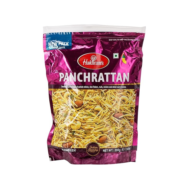 Haldiram’s is an Indian food company manufacturing a variety of traditional and western sweets, snacks, namkeens, etc. Haldiram Delhi Panchrattan is a crispy snack that contains a generous mix of nuts and spices.
