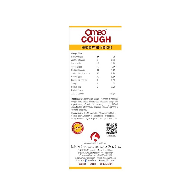Bjain Omeo Cough Syrup Sugar Free is a homoeopathic formulation that can help provide relief from cough. It may be used for all kinds of coughs.