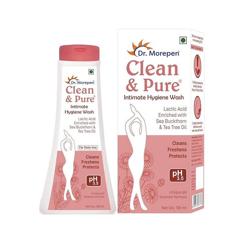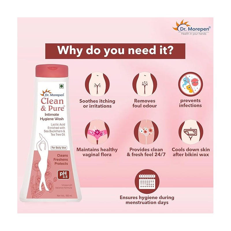 Dr Morepen Clean & Pure Intimate Hygiene Wash provides help in treating the irritation, itching, pain, odour and infection to the intimate areas throughout the month. Clean & Pure has been specially formulated to balance the pH level and keep the hygienic even during menstruation days.