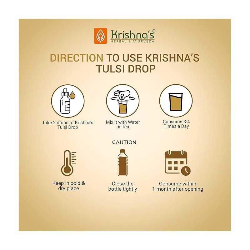 • How to Use: Take 1-2 drops of Krishna's Tulsi Drop in 250 ml water/tea/coffee mix well and drink. Drink 4-5 times a day or as directed by physician