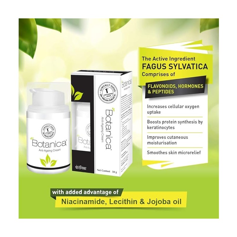 Anti-ageing and anti-wrinkle cream made from natural extract with additional benefits of niacinamide, lecithin and jojoba oil in 30 gm cream. The unique ingredient of Fagus sylvatica helps reduce ageing signs by improving cellular oxygen consumption thereby improving blood circulation and increasing cell renewal rate to improve skin firmness and elasticity.