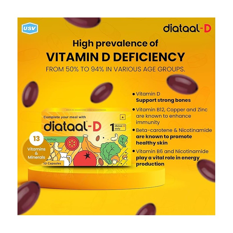 Diataal-D Multivitamin with Vitamin D For Heart Health Strong Bones Immunity & Health 10 Capsules Multivitamin for Men, Women & kids Diataal D is the perfect blend of 6 vitamins and 7 minerals, powered by Vitamin D and ALA (alpha lipoic acid) which takes care of your nutritional requirements for your good health and well-being. Persistent or periodic nutritional gaps are common and many of us don’t consume adequate amounts of certain foods, which may lead to further nutrient shortfalls. When the body doesn’t meet the nutritional criteria, one may feel weak and lethargic. Hence Diataal D is recommended with a healthy lifestyle.