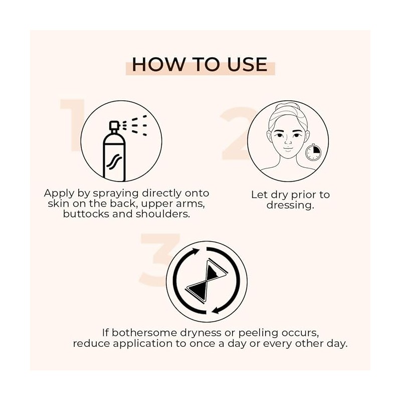 • PATIENT COMPLIANCE: An innovative spray formulation which gives a 3600 coverage to the body acne. It spreads perfectly on the skin and can be used single handily and highly effective body spray.