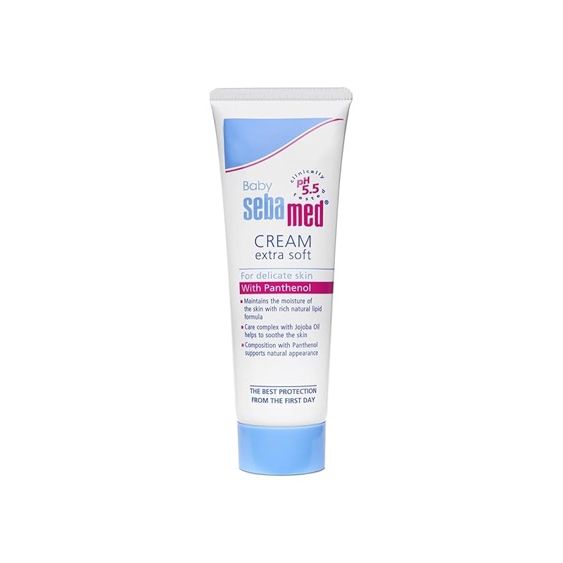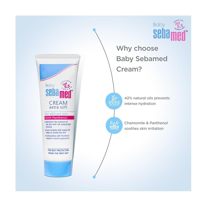 Sebamed Baby Cream Extra Soft is a clinically proven pH 5.5 cream which helps maintain a protective skin barrier. It is effective in atopic babies and helps soothe sensitive skin. It is rich in moisturising panthenol, allantoin, and chamomile extracts that help soothe and regenerate the baby’s sensitive skin. It contains jojoba oil which helps soothe the skin, and panthenol promotes regeneration.