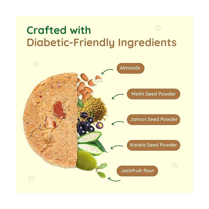 • POWERED BY AYURVEDIC INGREDIENTS: Our cookies contain the choicest ayurvedic ingredients such as Methi, Karela and Jamun Seeds, and Jackfruit flour. They are clinically proven to lower your blood sugar levels for better diabetes care.