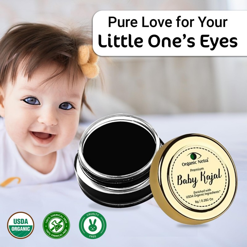• ✅ [USDA CERTIFIED ORGANIC INGREDIENTS]: Organic Netra baby kajal is enriched with USDA Certified Organic ingredients. Organic Netra baby kajal has a natural concoction of Organic Coconut Oil, Almond Oil, Castor Oil, Bhimdeni Kapur, BeesWax, and Organic Cow ghee. An all-natural blend of organic ingredients makes it a well-balanced product that gives a nourishing effect to the eyes of your baby.