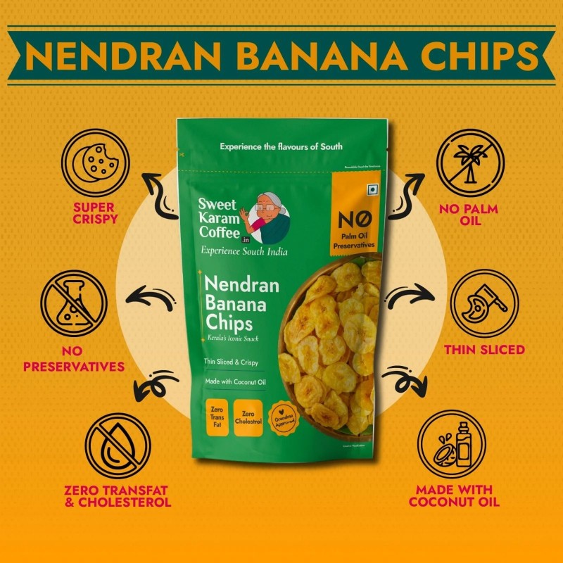• Nendran Banana Chips – Sweet Karam Coffee Banana Chips is Made with handpicked nendran bananas and 100% coconut oil, we create the perfect snack with authentic Kerala flavour to satisfy your cravings anywhere, anytime.
