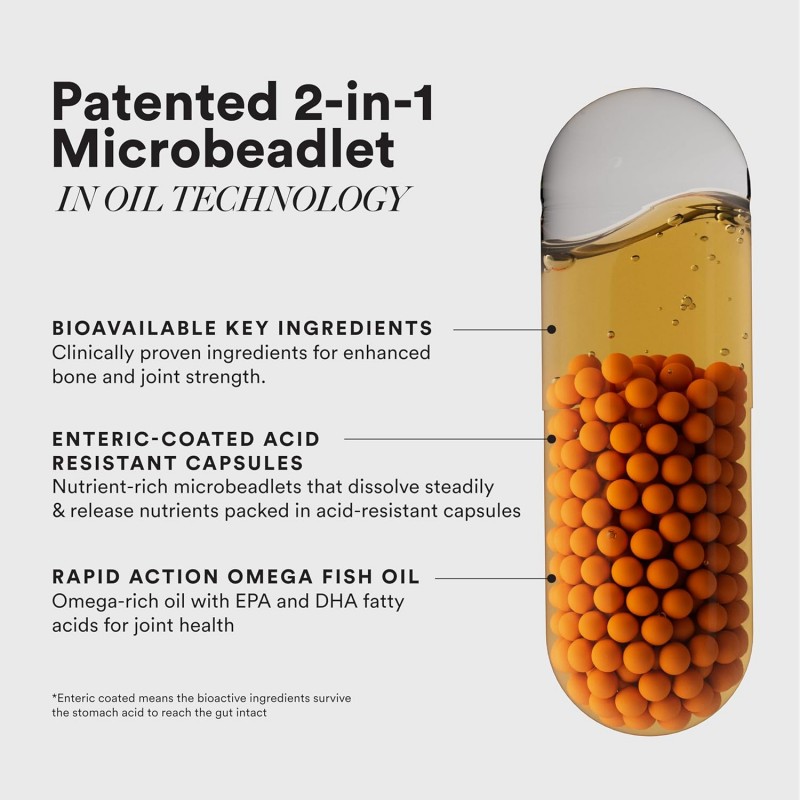 • POWER OF ANTIOXIDANTS + VITAMINS + MINERALS: SLOW Bone Support has been carefully formulated to include synergistic nutrients clinically proven to help with mobility, joint lubrication and good bone health. Intelligent capsule combines omega-3-rich fish oil as a fast absorbing base and a wonderful concoction of minerals like calcium, magnesium, boron; vitamins like VitaminD3, K2 and joint-friendly nutrients like glucosamine, chondroitin, MSM in the form of enteric-coated microbeadlets.