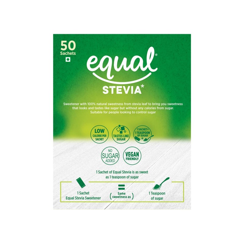 This pack contains 50 sachet of Equal Stevia Plant-Based Natural Sweetener