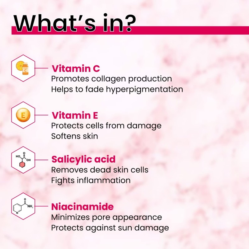 Kojic acid, Vitamin C, Liquorice, Nicotinamide, Glycolic acid, Lactic acid, Salicylic acid, Potassium hydroxide, Gum binder, EDTA, SLS, Preservatives, Perfume